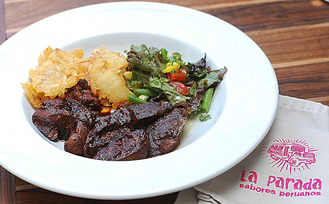 Higaditos Asaltados; Sauteed Chicken Livers with Soy Sauce and Chile, Salad, and Papas La Parada.